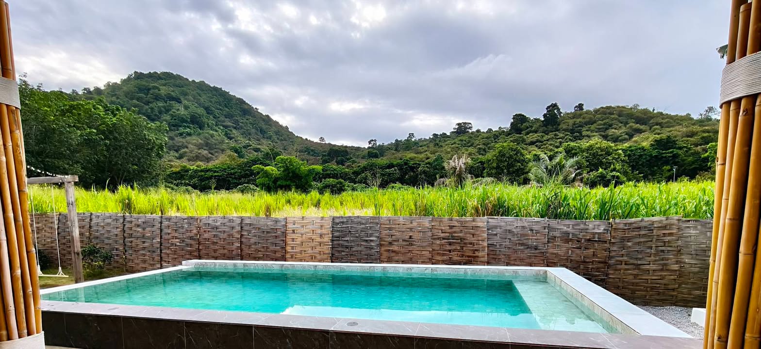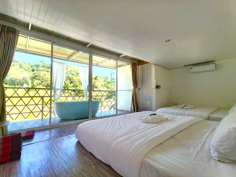 -ห้อง Familyมั่งคั่ง มีที่นอน 6 และ 7 ฟุต ห้องน้ำในตัว มีอ่าง วิวสระว่ายน้ำและวิวภูเขา สำหรับ 2-7 ท่าน