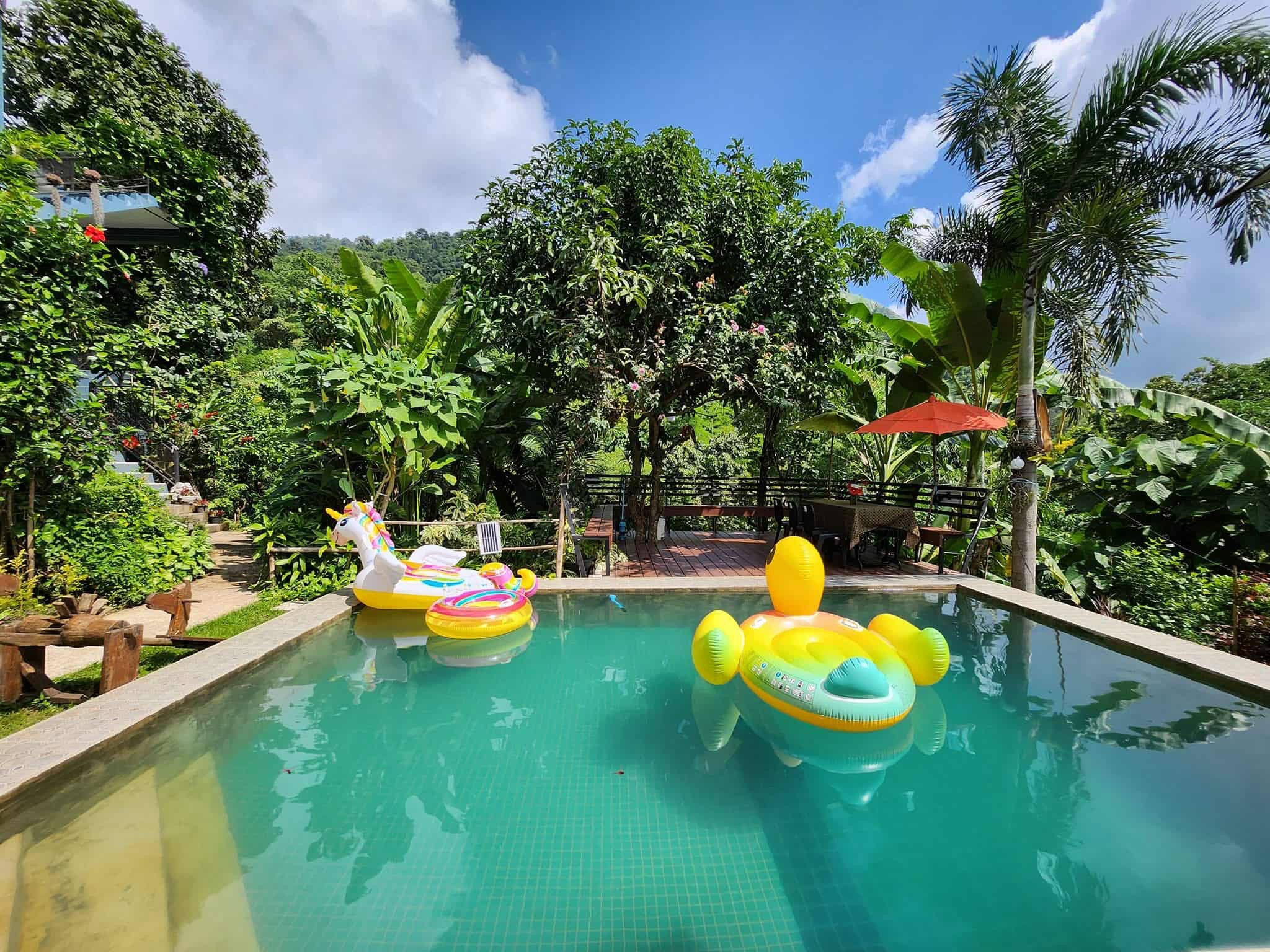 □ ในที่พักมี สระว่ายน้ำเล่นได้ทั้งปี และ ลำธารน้ำตกธรรมชาติเล่นได้ตามฤดูกาล