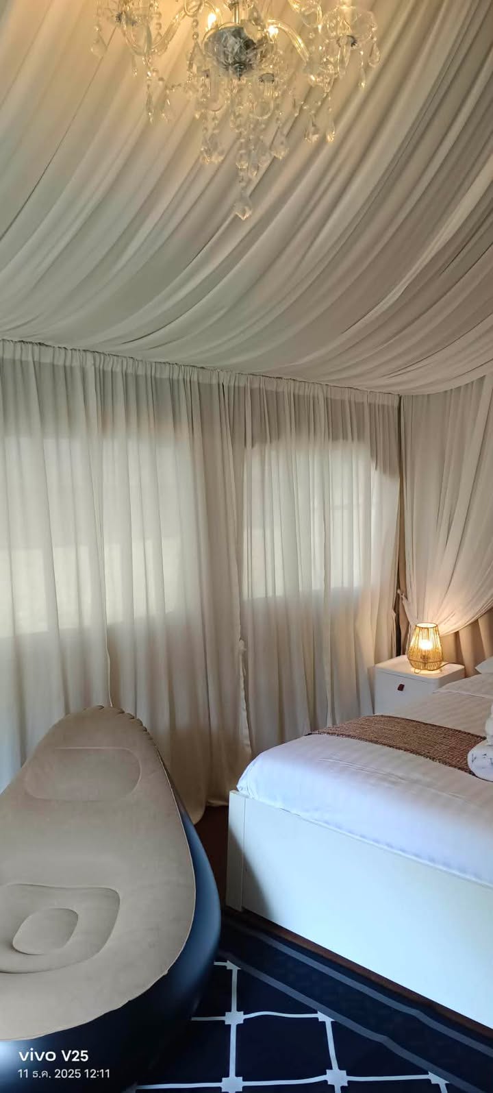 เต็นท์พักผ่อนที่ตกแต่งอย่างพิถีพิถัน ภายในบุผ้าสีอ่อน โปร่งนุ่มทั้งเต็นท์