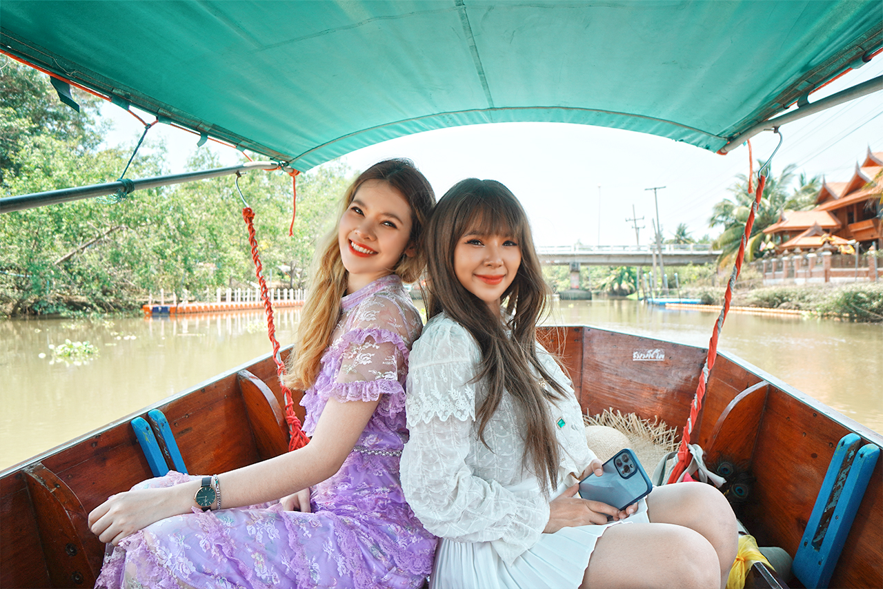 กิจกรรมหลักที่เราเลือกทำ ก็คือการนั่งเรือเที่ยววัด ชมวิวสองข้างทางของชุมชนอัมพวาค่ะ